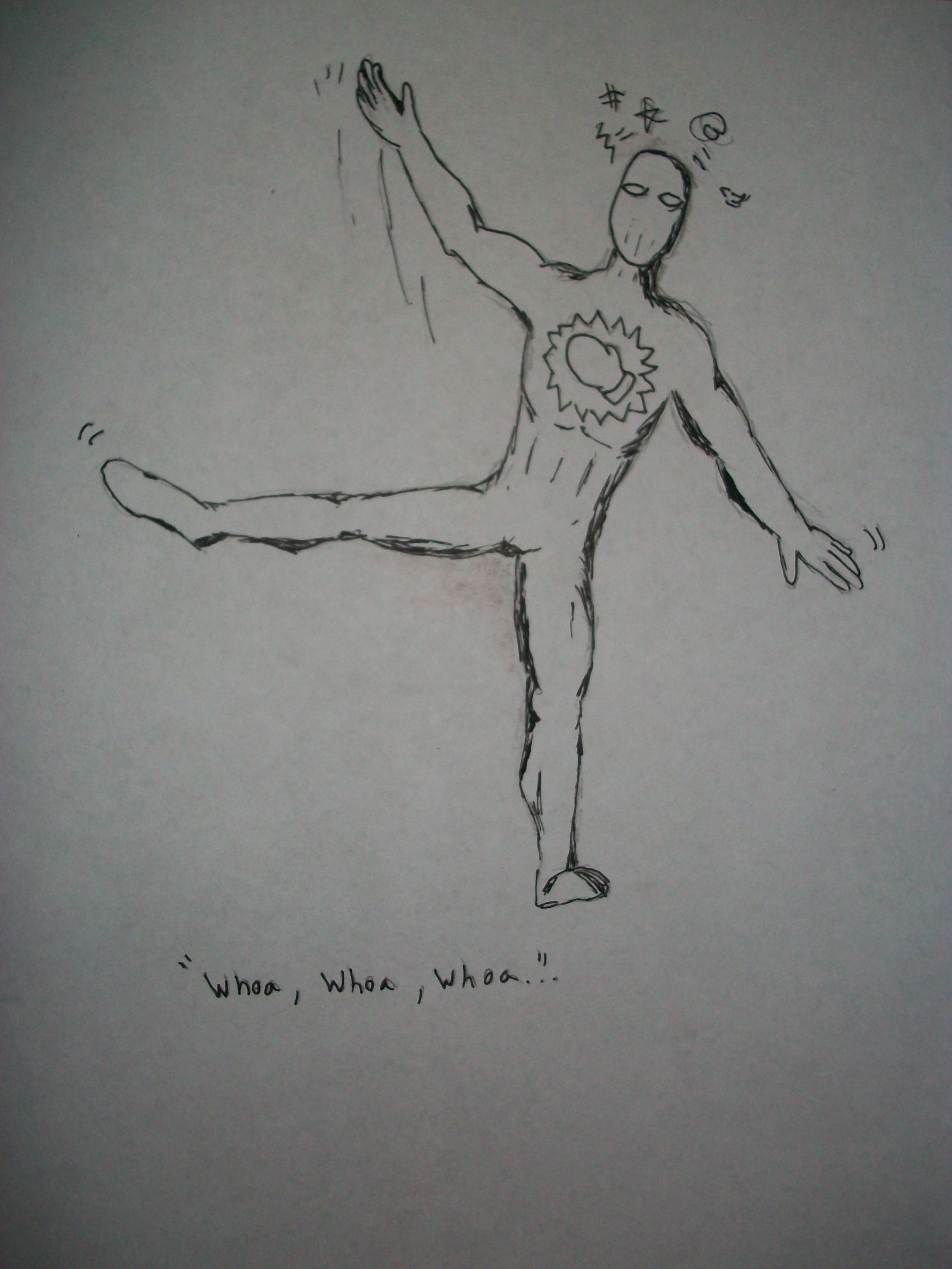 Here’s why I leave the artwork to Turner. This is the design I had in my head for The Punching Bag, the titular protagonist of my novella in the Kindle store. The basic principle’s the same, I just have a full head Spider-Man style mask, and I believe the boxing glove is actually reversed in the chest insignia. Either way, I’m maybe par as an artist, and for some reason I felt like drawing him off balance.