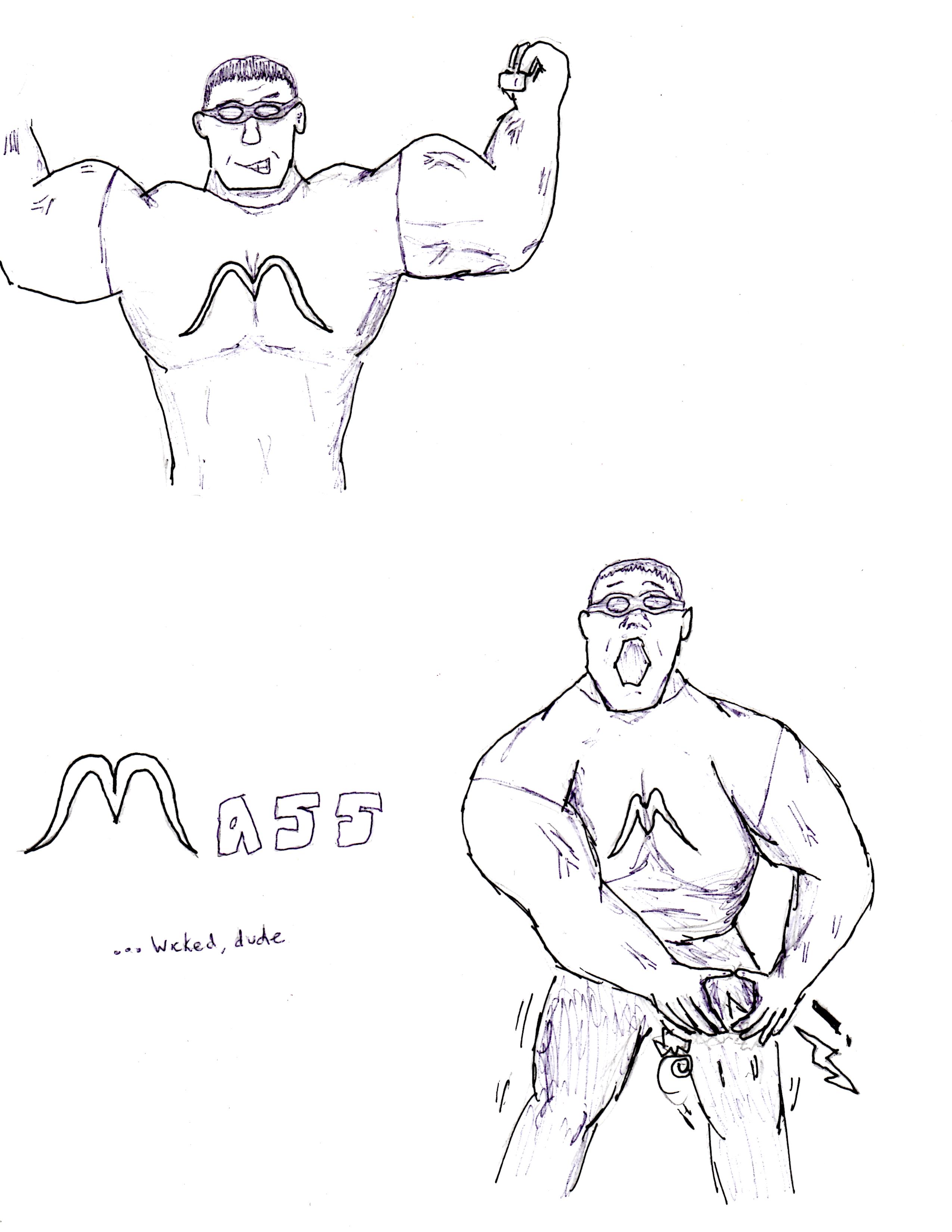 I put together this little pen and pencil piece featuring a supporting character from my novella, The Punchin’ Bag. His name is Mass, essentially a ‘roided out giant with ridiculous muscles and a prominent Boston accent. He’s shown here doing two of his favorite activities: flexing and tearing one of his artificially inflated muscles.