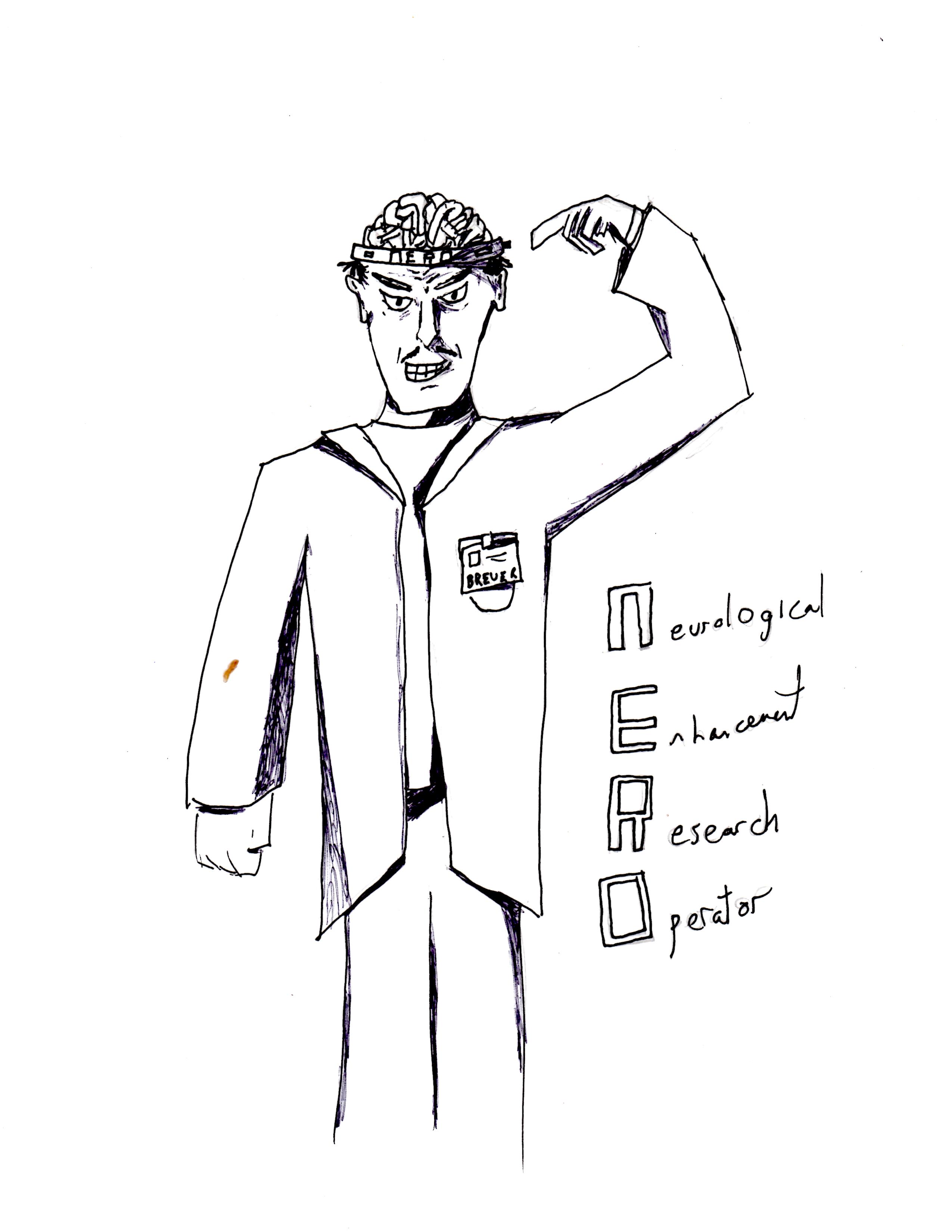 Here is a black and white inked sketch of Nero, the antagonist of both of my novellas, The Punching Bag and Tex Arkana. With the Neurological Enhancement Research Operator atop his exposed brain (which is protected by another of his devices, the polymerizer, which renders materials a nigh indestructible plastic), Nero lives up to two supervillain cliches: a brilliant mind bogged down by perpetually scheming, and ridiculous acronyms