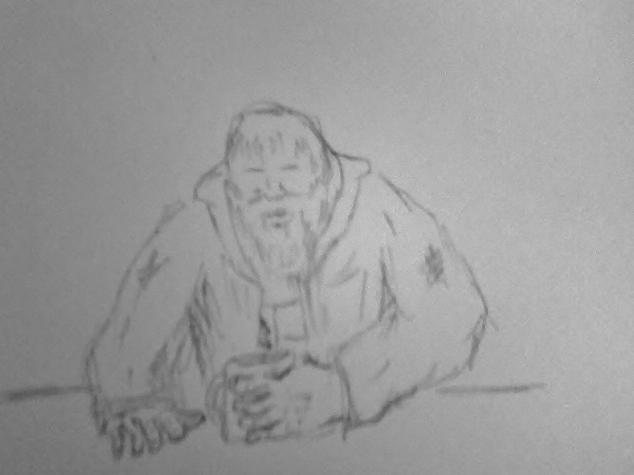 This is just a little pencil sketch of a homeless guy clinging to a cup of coffee, inspired by events in my e-book Tex Arkana