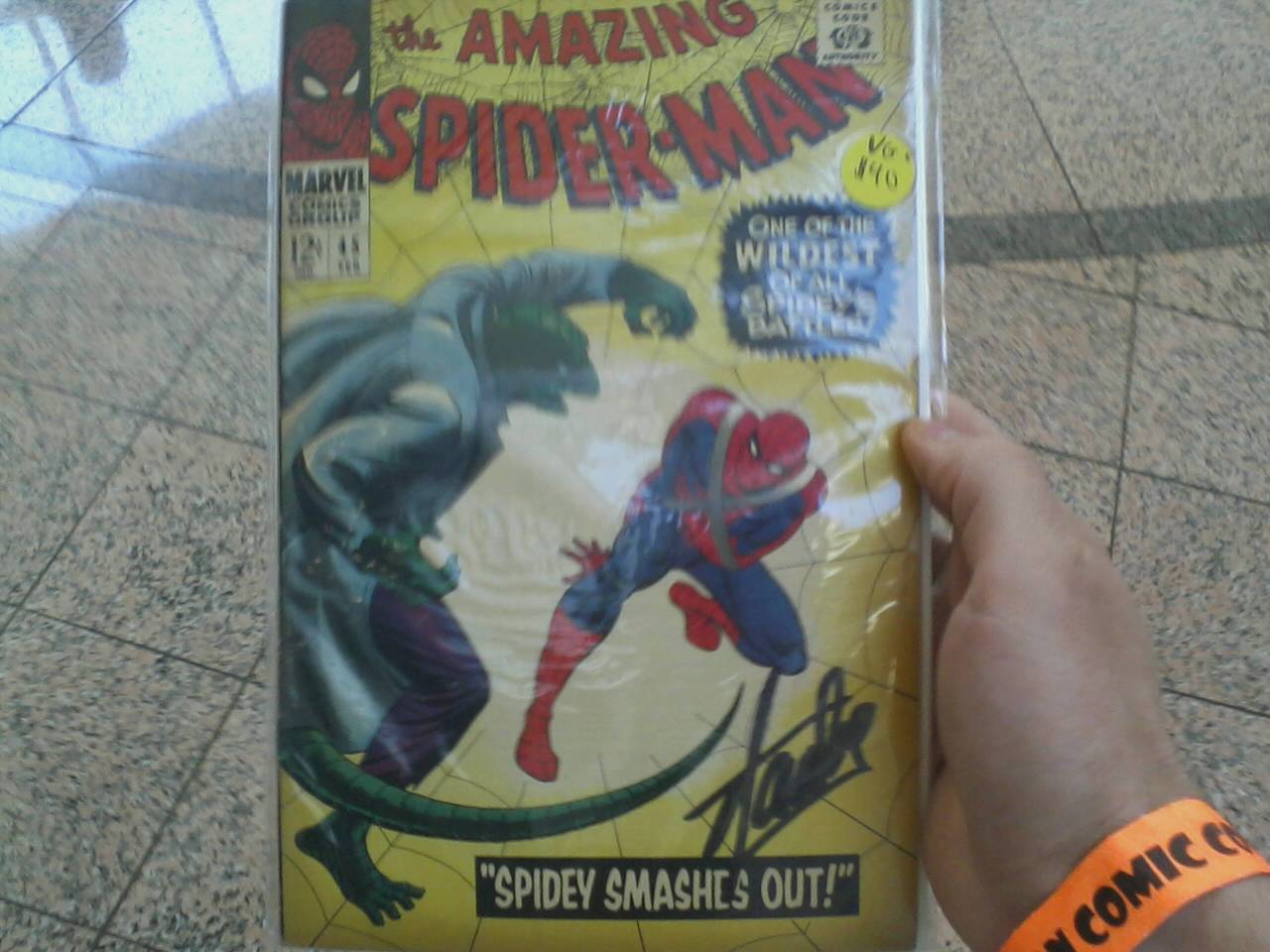 The first comic I ever owned was a ragged reprint of Amazing Spider-Man #45 (I wrote about it here). Eventually, as I became an adult, I “closed the loop” and got an original ASM #45 to look good alongside his more modest brother. When I saw that Stan Lee was going to be at the Boston Comic Con this year, I knew exactly what book I was going to get signed. After a brief wait in line (it really wasn’t bad, and I knew I was around appreciative comic book fans) I got up to the table. While Stan’s eyes were down on the table most of the time (part and parcel with keeping such a line moving at such a brisk pace), for a second he looked up after he signed my book (I also think he gave a slight indication that he doesn’t see this particular issue all the time). He smiled a polite smile as I briefly said that he was an inspiration and thanked him. All that waiting and money for about a second of interaction and I was not disappointed. Thanks, Stan.