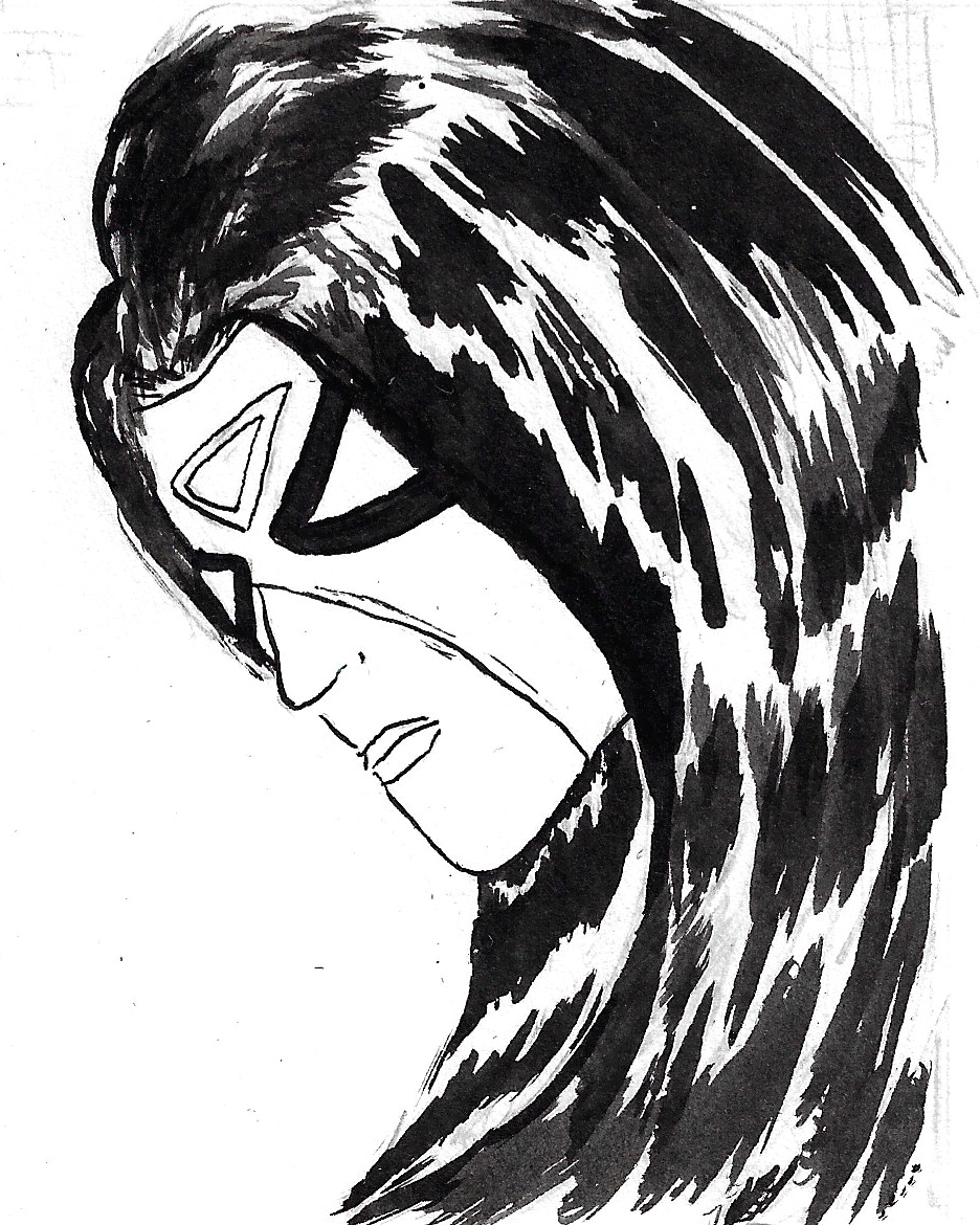 More October art. I do like the notion of just doing a bunch of little pieces because it’s [a month], and I sure as shootin’ don’t like to stick to prompts. So here’s Spider-Woman (working on hair textures), a nut hatch (mixing blue and black inks), penguin (different pen, minimalism) and a nighthawk (loose lines).