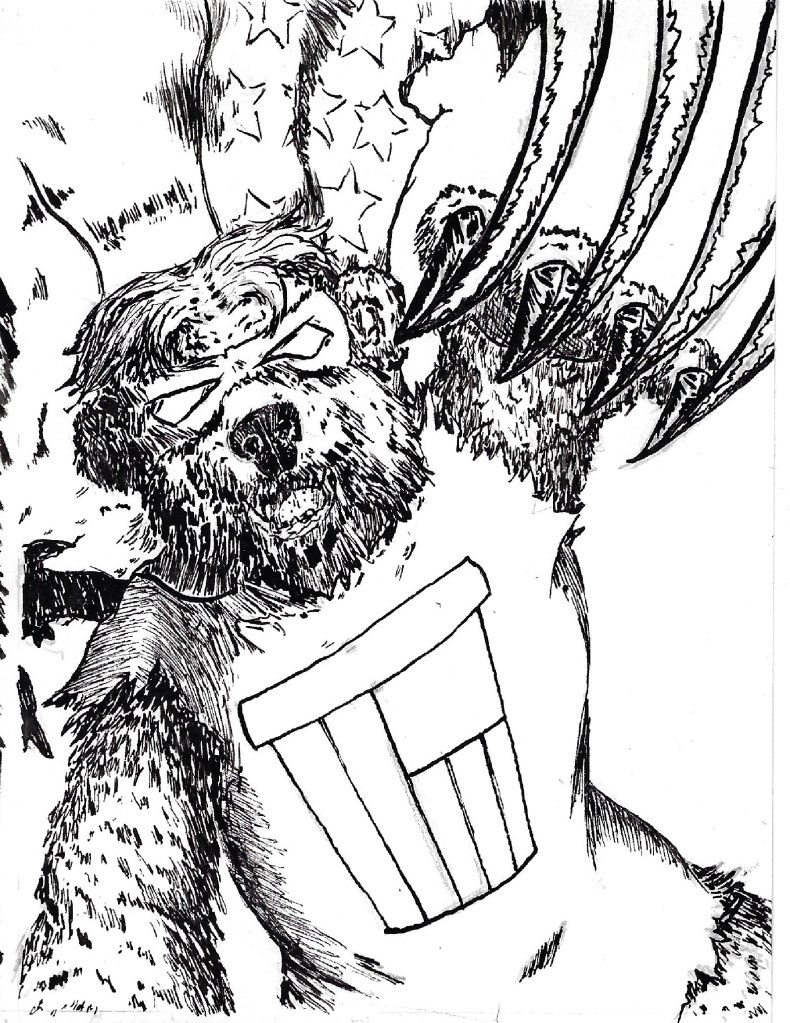 One day I’m going to write more Punchin’ Bag, do a Kickstarter about it, and offer trading cards as a freebie. That’s at least one other graphic novel away, so in the meantime here are some images. This one’s Flag-Bear-er, my pun filled take on American superheroes. Check back next week for a colored version.