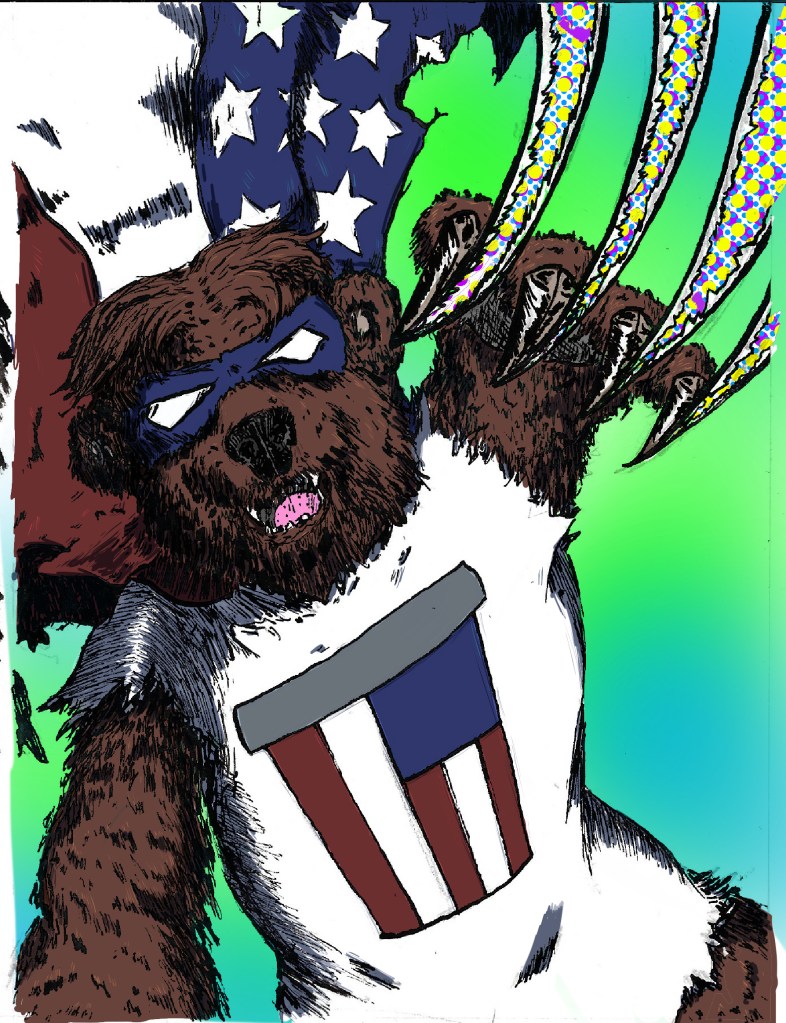 One day I’m going to write more Punchin’ Bag, do a Kickstarter about it, and offer trading cards as a freebie. That’s at least one other graphic novel away, so in the meantime here are some images. This one’s Flag-Bear-er, in his full color glory.