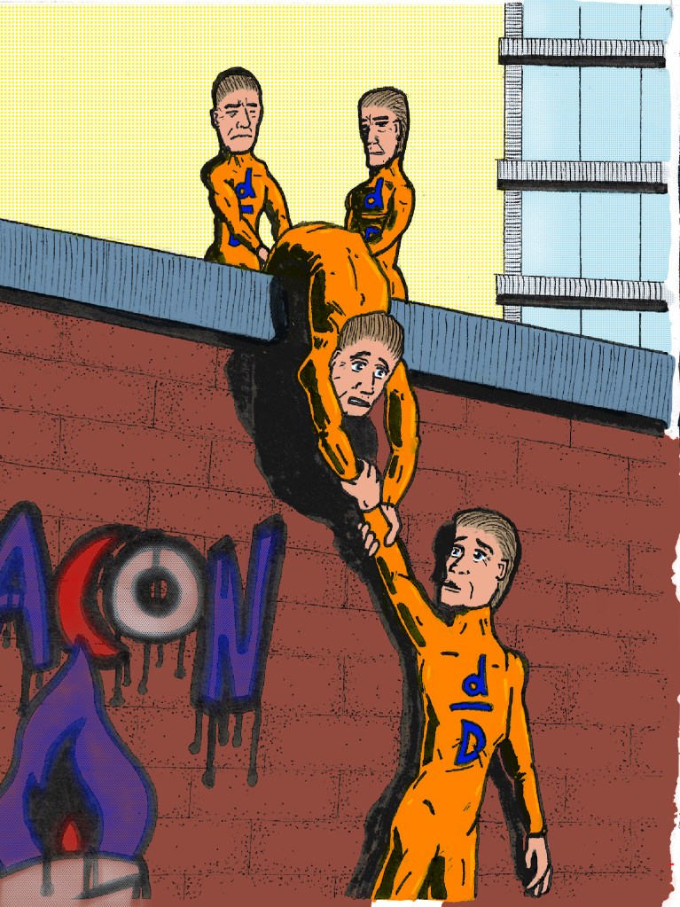 One day I’m going to write more Punchin’ Bag, do a Kickstarter about it, and offer trading cards as a freebie. That’s at least one other graphic novel away, so in the meantime here are some images. This one’s Dividing Dude, with his finite mass. Thanks to Turner for the inks and embellishments on my breakdown (so comicy).